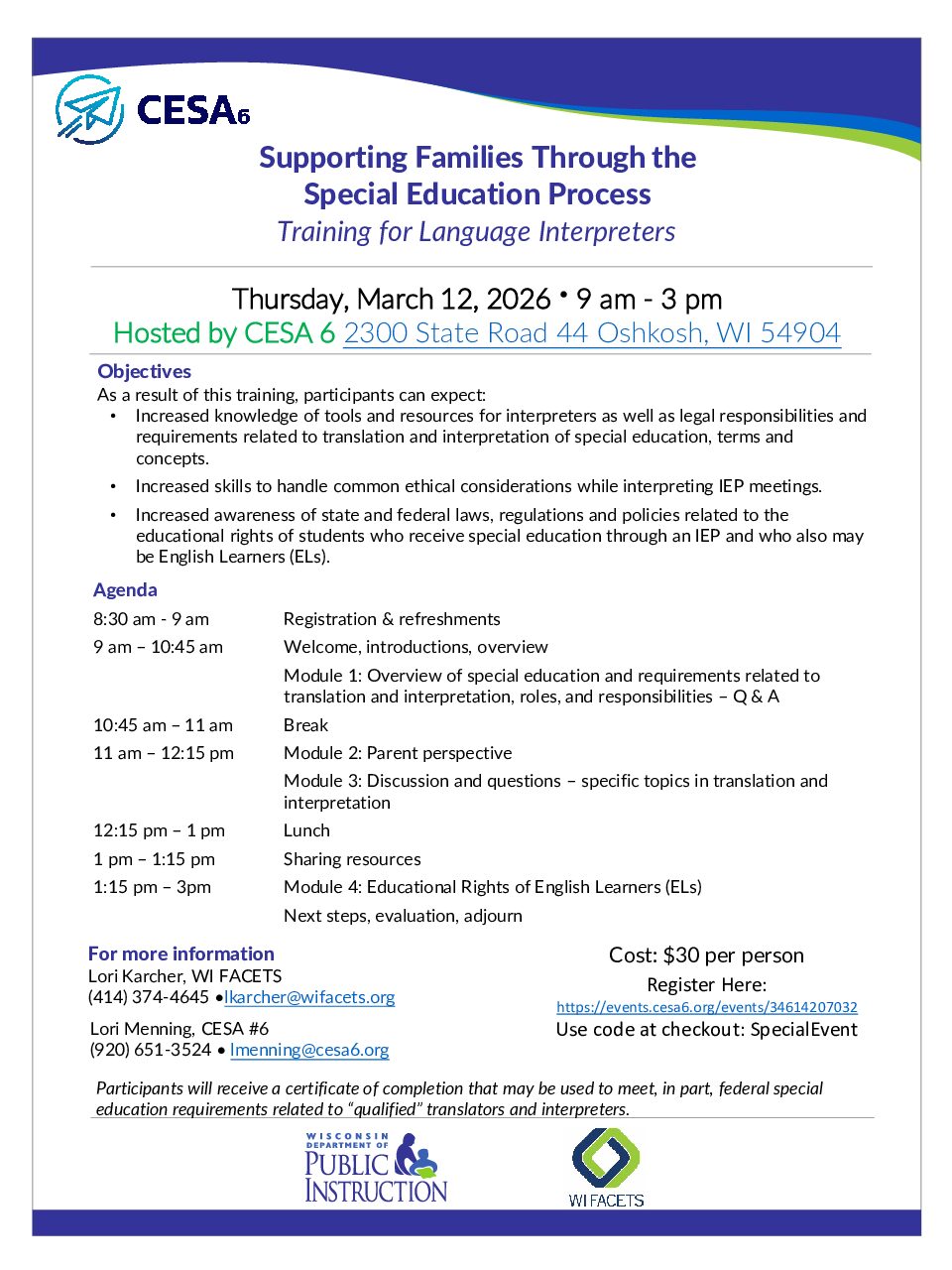 Interpreter Training Flyer (CESA 6) Interpreter Training Flyer (CESA 6) March 12th, 2026 Melissa Voegeli2025-12-17T16:09:29+00:00December 9, 2025| Read More
